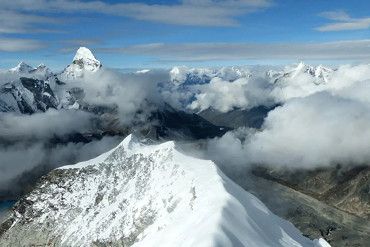 As we get closer to Island peak climbing gallery, you will observe the dramatic change in landscape and Himalayas comes fully into view. After 6 hrs climb to island peak summit from the base camp, provide the surrounding massive view of high mountain wall and white blue ice and hard rock hang more than 6000m above. From the summit of Island peak, the huge mountains, we can get splendid panorama of enormous mountains - Nuptse (7,879meter), Lhotse (8,501meter), Lhotse Middle Peak (8,410meter) and Lhotse Shar (8,383meter) which designs a semicircle in the north and the marvellous views of Makalu (8475meter), Baruntse (7129m) in the east and well known expedition mountain of Ama Dablam (6812meter) in the south - a never to be forgotten peak climbing journey to Island peak real experience of Himalayas.
